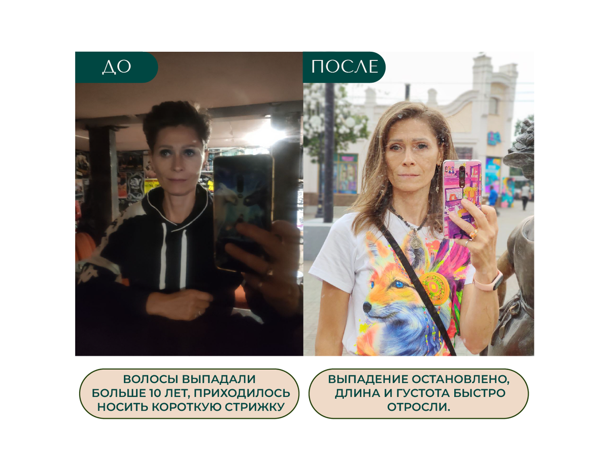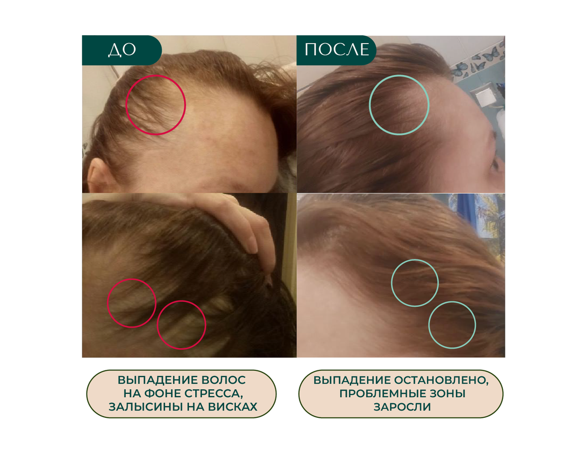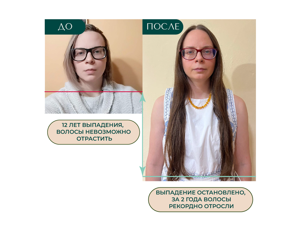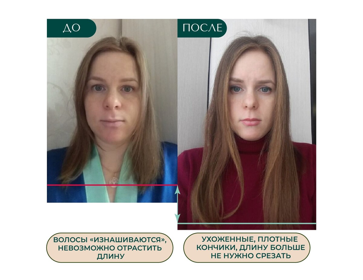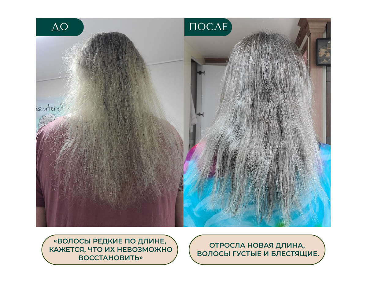 Волосы перестали выпадать, а проблемные места заросли новыми волосками, стержни волос перестали сечься и обламываться, стали завиваться, появился естественный объем без укладок, цвет волос стал глубже и насыщеннее, появилось больше энергии и желания уделять время себе и своему здоровью.