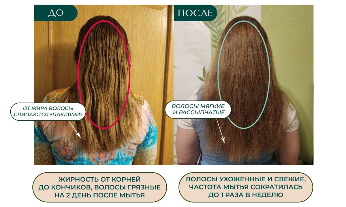 Чувствительная кожа головы, перхоть, зуд и высыпания; сильная жирность волос — голова выглядела несвежей уже через сутки после мытья; волосы, которые сильно выпадали и ломались; секущиеся кончики.